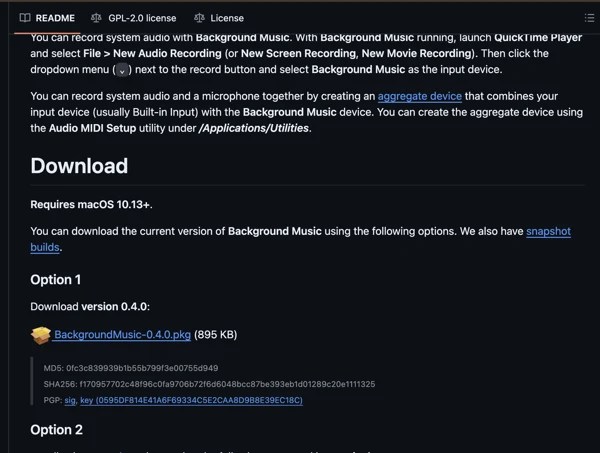 ▲大きく Download と書かれたセクションがあり、そのOption 1という記載の下に最新のBackgroundMusicのインストーラーがある。