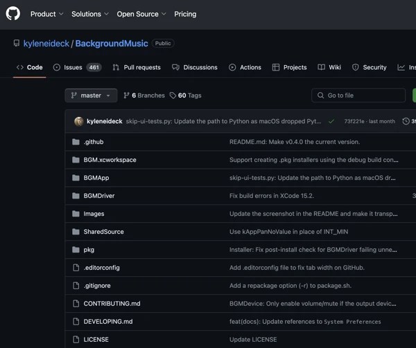 ここからGitHubのBackgroundMusicのページ(URL: https://github.com/kyleneideck/BackgroundMusic)を開いてみよう。